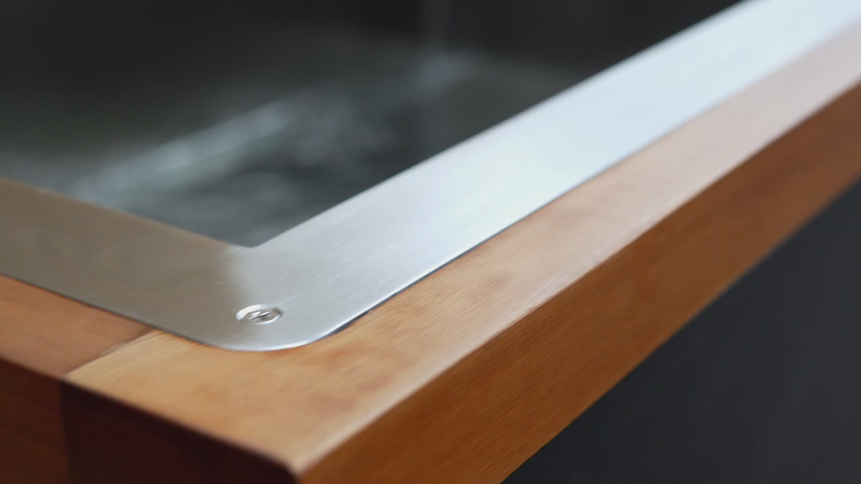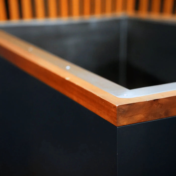 The timeless charcoal powder coated exterior combined with the rich Pacific red cedar trim and stainless steel tub create a striking blend of natural elegance & modern luxury, perfect for enhancing any space.