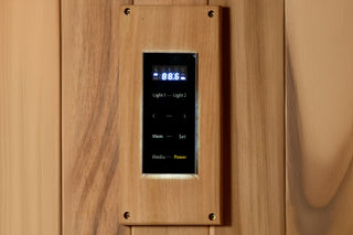 The Golden Designs Osla model sauna features a traditional steam heating element. It's designed for indoors, or covered outdoor use. Other features include: