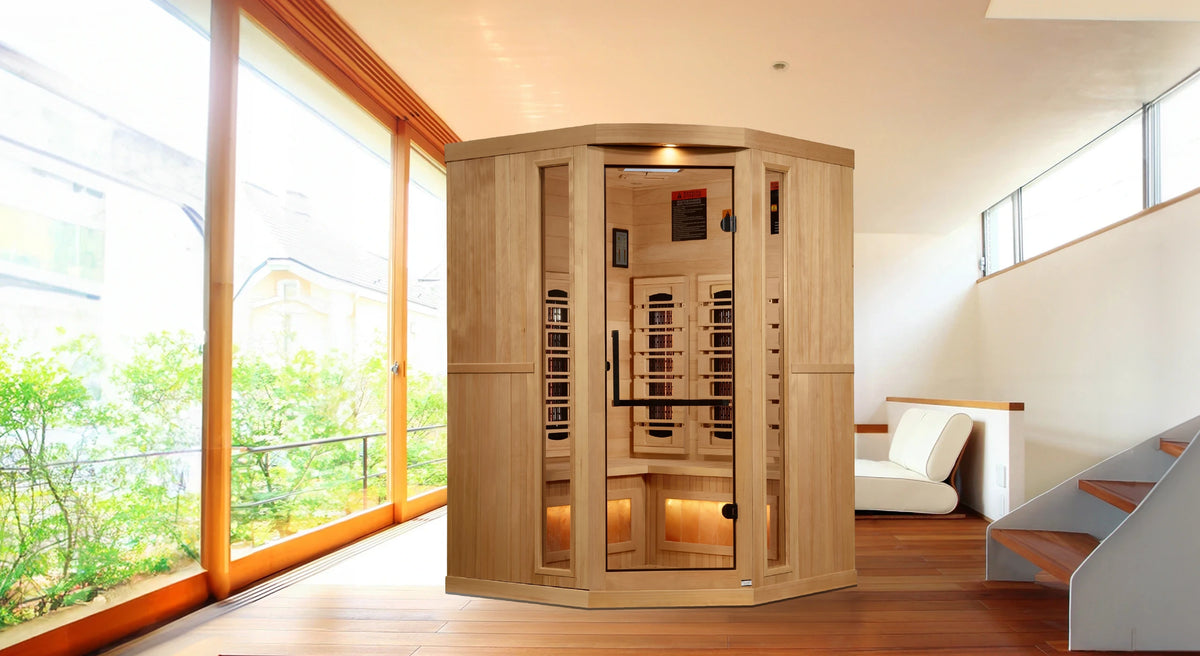 Golden Designs 2025 Reserve Edition Full Spectrum Infrared Sauna with Himalayan Salt Bar - 3 Person Indoor Corner Model - Under 1mG (near zero) is backordered and will ship as soon as it is back in stock.
